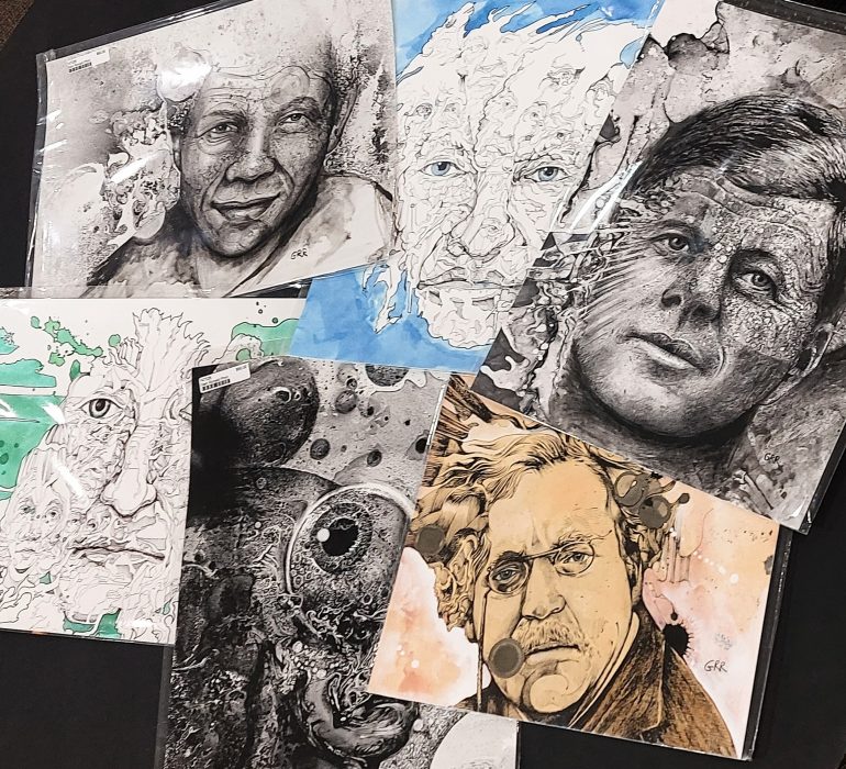 Glen Ronald creates original, unique paintings and subconscious illustrations that are colourful, playful, and energetic. He uses a variety of media and techniques that appeals to a variety of aesthetics. Glen’s art imagery begins in chaos, on the edge of oblivion where failure is a possibility, but then he finds the ideas and order within the chaos and pulls them out to create powerful, meaningful images. His artwork is a mix of realism, abstraction, and surrealism. He creates portraits, wildlife paintings, and landscapes. Many of his pieces use ink as a medium for its unpredictable way of behaving. He received an Honours Degree in Microbiology, and dabbled in steelwork and teaching, but following that he pursued fine arts which is his passion. Glen works and resides in Edmonton, Alberta.