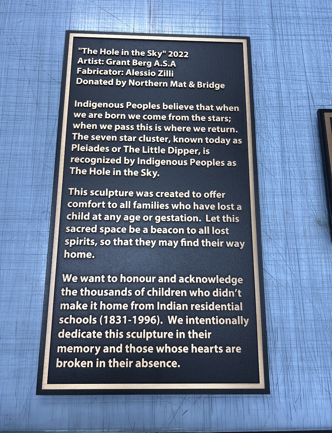 I was asked to create a sculpture to remember Indigenous children lost or forgotten to the residential school system. I used a story I heard as the inspiration. For Indigenous Peoples across Turtle Island, it is believed we come from the stars and when we pass, we return to the stars. One specific constellation is identified, today known as the Little Dipper or Pleiades, then known as The Hole in the Sky.